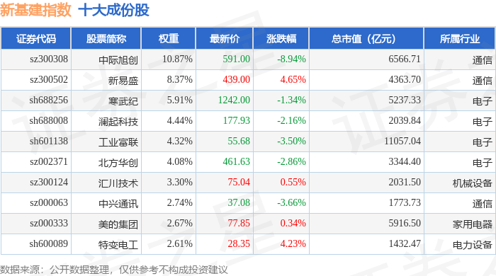 新基建(980029)指数十大成份股详情如下: