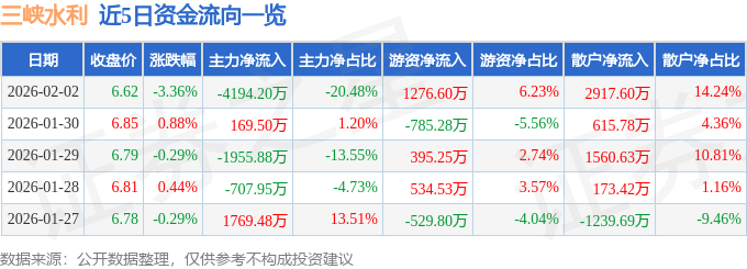 证券之星消息,截至2026年2月2日收盘,三峡水利(600116)报收于6.62元,下跌3.36%,换手率1.6%,成交量30.56万手,成交额2.05亿元。