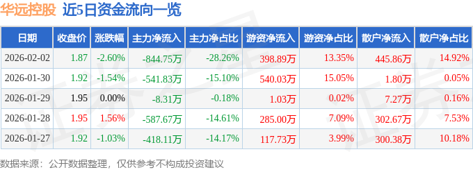 证券之星消息,截至2026年2月2日收盘,华远控股(600743)报收于1.87元,下跌2.6%,换手率0.67%,成交量15.7万手,成交额2988.83万元。