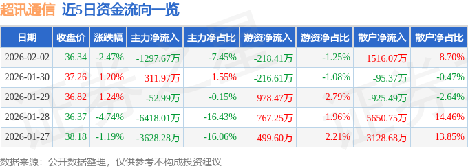 证券之星消息,截至2026年2月2日收盘,超讯通信(603322)报收于36.34元,下跌2.47%,换手率2.99%,成交量4.71万手,成交额1.74亿元。