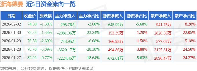 证券之星消息,截至2026年2月2日收盘,浙海德曼(688577)报收于74.5元,下跌1.39%,换手率1.36%,成交量1.52万手,成交额1.14亿元。