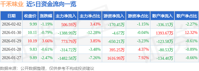 证券之星消息,截至2026年2月2日收盘,千禾味业(603027)报收于9.99元,下跌1.19%,换手率1.16%,成交量14.54万手,成交额1.48亿元。