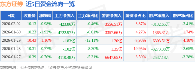 证券之星消息,截至2026年2月2日收盘,东方证券(600958)报收于10.13元,下跌0.98%,换手率1.2%,成交量89.8万手,成交额9.18亿元。