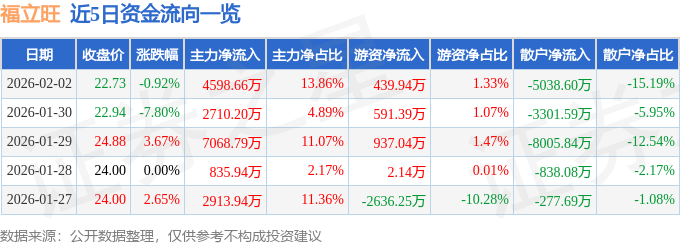2月2日的资金流向数据方面,主力资金净流入4598.66万元,占总成交额13.86%,游资资金净流入439.94万元,占总成交额1.33%,散户资金净流出5038.6万元,占总成交额15.19%。