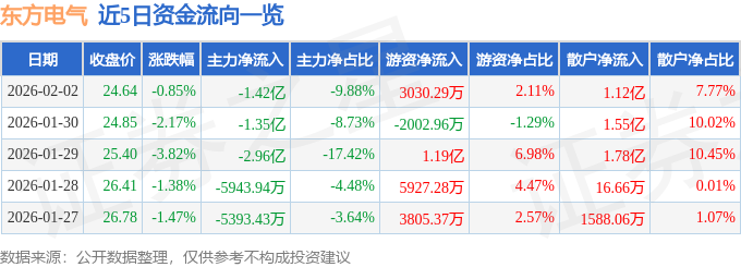 证券之星消息,截至2026年2月2日收盘,东方电气(600875)报收于24.64元,下跌0.85%,换手率2.52%,成交量57.12万手,成交额14.4亿元。