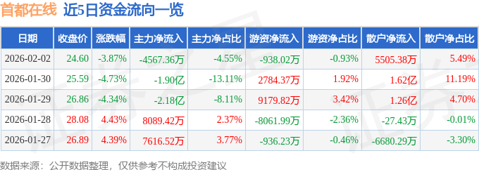证券之星消息,截至2026年2月2日收盘,首都在线(300846)报收于24.6元,下跌3.87%,换手率10.14%,成交量39.81万手,成交额10.03亿元。