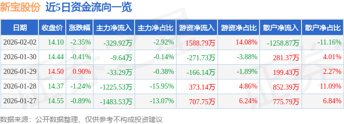 证券之星消息,截至2026年2月2日收盘,新宝股份(002705)报收于14.1元,下跌2.35%,换手率0.97%,成交量7.88万手,成交额1.13亿元。