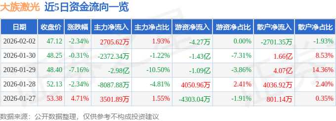 证券之星消息,截至2026年2月2日收盘,大族激光(002008)报收于47.12元,下跌2.34%,换手率3.09%,成交量29.54万手,成交额14.02亿元。