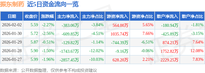 证券之星消息,截至2026年2月2日收盘,振东制药(300158)报收于5.59元,下跌2.27%,换手率1.77%,成交量17.54万手,成交额9982.18万元。