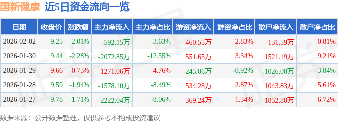 证券之星消息,截至2026年2月2日收盘,国新健康(000503)报收于9.25元,下跌2.01%,换手率1.77%,成交量17.36万手,成交额1.63亿元。