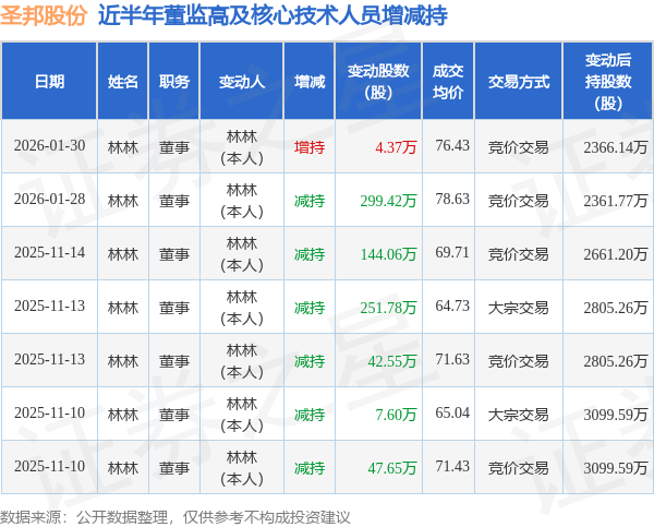 圣邦股份:1月30日高管林林增持股份合计4.37万股