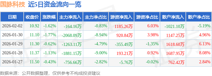 证券之星消息,截至2026年2月2日收盘,国脉科技(002093)报收于10.92元,下跌1.62%,换手率1.76%,成交量17.73万手,成交额1.97亿元。