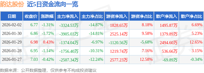 证券之星消息,截至2026年2月2日收盘,韵达股份(002120)报收于6.77元,下跌1.31%,换手率1.16%,成交量32.74万手,成交额2.24亿元。