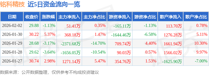 证券之星消息,截至2026年2月2日收盘,铭科精技(001319)报收于29.88元,下跌1.13%,换手率5.89%,成交量4.83万手,成交额1.46亿元。
