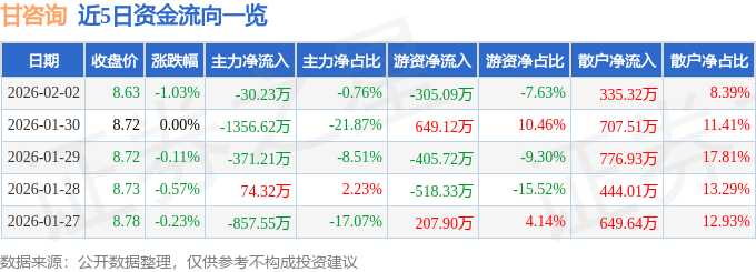 证券之星消息,截至2026年2月2日收盘,甘咨询(000779)报收于8.63元,下跌1.03%,换手率0.99%,成交量4.59万手,成交额3996.46万元。