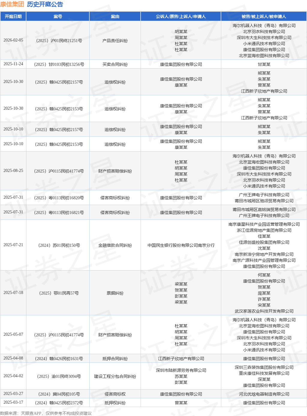 根据统计,近一年内以康佳集团股份有限公司为当事人的历史开庭公告有16则,其中案由为“追偿权纠纷”的公告以4则居首,其次为“侵害商标权纠纷”有2则,“财产损害赔偿纠纷”有2则。历史开庭公告如下: