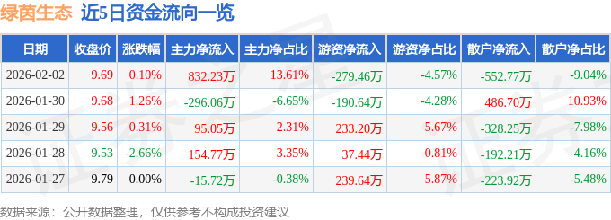 证券之星消息,截至2026年2月2日收盘,绿茵生态(002887)报收于9.69元,上涨0.1%,换手率3.21%,成交量6.24万手,成交额6116.97万元。