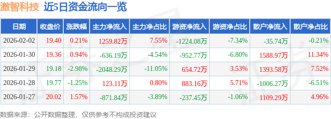 证券之星消息,截至2026年2月2日收盘,激智科技(300566)报收于19.4元,上涨0.21%,换手率3.75%,成交量8.49万手,成交额1.67亿元。