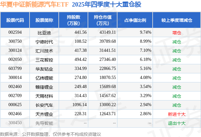 华夏中证新能源汽车ETF基金成立于2020年2月20日,基金经理为李俊,基金跟踪标的为中证新能源汽车指数,成立以来超额回报为7.38%,近一个月超额回报为-0.01%。最新披露的基金持仓数据显示,截止2025年12月31日,该基金第一大重仓股为比亚迪(002594),持股占比为9.74%。