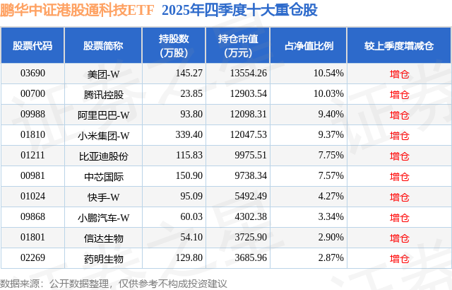 鹏华中证港股通科技ETF基金成立于2021年12月10日,基金经理为张羽翔,基金跟踪标的为中证港股通科技指数,成立以来超额回报为-3.91%,近一个月超额回报为-1.02%。最新披露的基金持仓数据显示,截止2025年12月31日,该基金第一大重仓股为美团-W(03690),持股占比为10.54%。