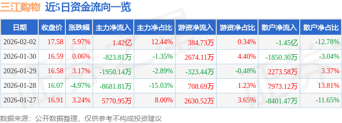 证券之星消息,截至2026年2月2日收盘,三江购物(601116)报收于17.58元,上涨5.97%,换手率11.82%,成交量64.73万手,成交额11.38亿元。