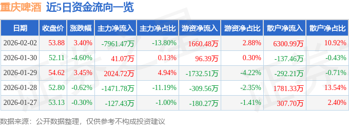 证券之星消息,截至2026年2月2日收盘,重庆啤酒(600132)报收于53.88元,上涨3.4%,换手率2.2%,成交量10.66万手,成交额5.77亿元。