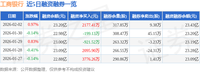 证券之星消息,截至2026年2月2日收盘,工商银行(601398)报收于7.32元,上涨0.97%,换手率0.2%,成交量541.18万手,成交额39.7亿元。