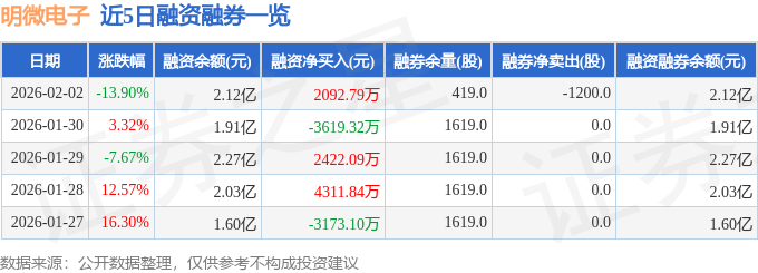 证券之星消息,截至2026年2月2日收盘,明微电子(688699)报收于58.71元,下跌13.9%,换手率7.87%,成交量8.66万手,成交额5.23亿元。