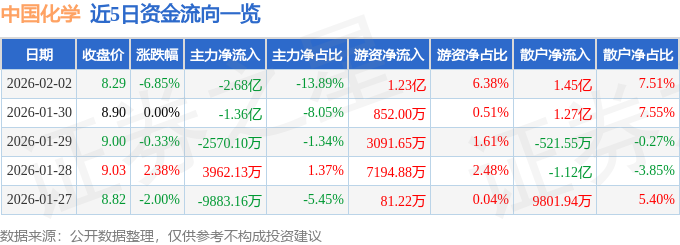 证券之星消息,截至2026年2月2日收盘,中国化学(601117)报收于8.29元,下跌6.85%,换手率3.72%,成交量226.62万手,成交额19.27亿元。