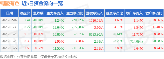 证券之星消息,截至2026年2月2日收盘,铜陵有色(000630)报收于7.44元,下跌10.04%,已连续跌停2天,换手率0.74%,成交量82.36万手,成交额6.13亿元。