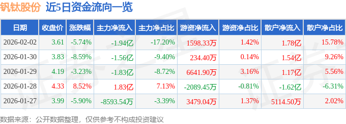 证券之星消息,截至2026年2月2日收盘,钒钛股份(000629)报收于3.61元,下跌5.74%,换手率3.27%,成交量304.07万手,成交额11.28亿元。
