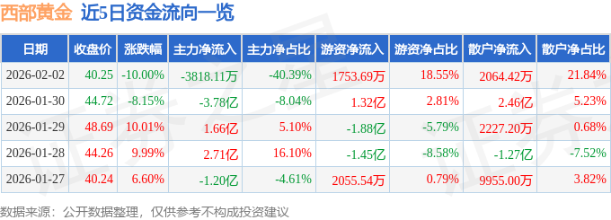 证券之星2月3日盘中消息,10点10分西部黄金(601069)触及跌停板。其所属行业贵金属目前下跌。领涨股为湖南黄金。该股为有色金属,国企改革,新疆概念概念热股,当日有色金属概念上涨1.05%,国企改革概念上涨1.0%,新疆概念概念上涨0.55%。