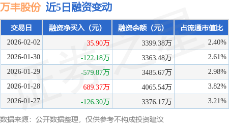 证券之星消息,2月2日,万丰股份(603172)融资买入257.25万元,融资偿还221.35万元,融资净买入35.9万元,融资余额3399.38万元。