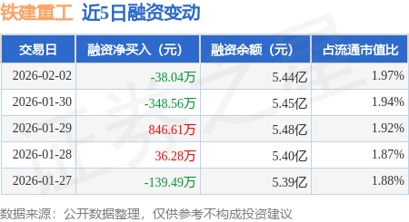 证券之星消息,2月2日,铁建重工(688425)融资买入1661.16万元,融资偿还1699.2万元,融资净卖出38.04万元,融资余额5.44亿元。