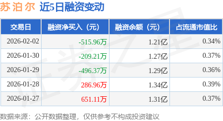 证券之星消息,2月2日,苏 泊 尔(002032)融资买入801.57万元,融资偿还1317.53万元,融资净卖出515.96万元,融资余额1.21亿元。