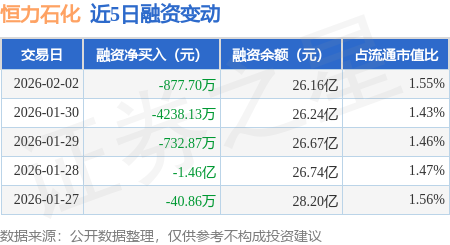证券之星消息,2月2日,恒力石化(600346)融资买入1.08亿元,融资偿还1.16亿元,融资净卖出877.7万元,融资余额26.16亿元。