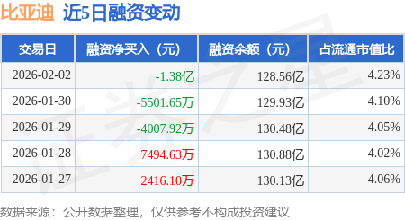 证券之星消息,2月2日,比亚迪(002594)融资买入5.04亿元,融资偿还6.42亿元,融资净卖出1.38亿元,融资余额128.56亿元。