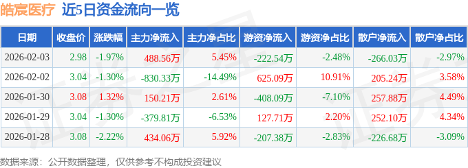 证券之星消息,截至2026年2月3日收盘,皓宸医疗(002622)报收于2.98元,下跌1.97%,换手率3.55%,成交量29.85万手,成交额8966.87万元。