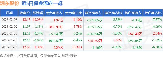 证券之星消息,远东股份2月3日涨停收盘,收盘价13.17元。该股于14点11分涨停,未打开涨停,截止收盘封单资金为1.08亿元,占其流通市值0.37%。