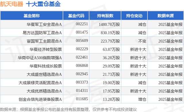 根据2025基金年报公募基金重仓股数据,重仓该股的公募基金共14家,其中持有数量最多的公募基金为华夏基金的华夏军工安全混合A。华夏军工安全混合A目前规模为38.4亿元,最新净值2.205(2月2日),较上一交易日下跌2.56%,近一年上涨74.03%。该公募基金现任基金经理为万方方。