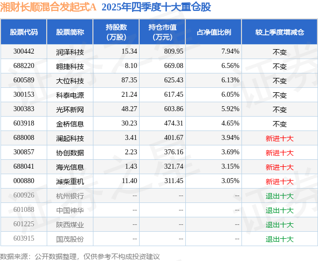 根据2025基金年报公募基金重仓股数据,重仓该股的公募基金共3家,其中持有数量最多的公募基金为湘财基金的湘财长顺混合发起式A。湘财长顺混合发起式A目前规模为0.69亿元,最新净值0.9516(2月2日),较上一交易日下跌1.8%,近一年上涨34.83%。该公募基金现任基金经理为包佳敏。包佳敏在任的基金产品包括:湘财长源股票型A,管理时间为2024年3月4日至今,期间收益率为58.98%;湘财均衡甄选混合A,管理时间为2024年3月4日至今,期间收益率为-2.36%;湘财红利量化选股混合A,管理时间为2024年3月29日至今,期间收益率为15.29%。