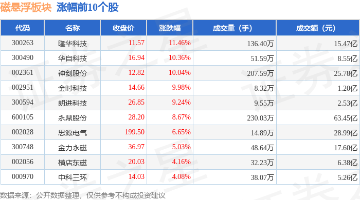 证券之星消息,2月3日磁悬浮板块较上一交易日上涨3.2%,隆华科技领涨。当日上证指数报收于4067.74,上涨1.29%。深证成指报收于14127.1,上涨2.19%。磁悬浮板块个股涨跌见下表:
