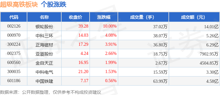 证券之星消息,2月3日超级高铁板块较上一交易日上涨3.04%,银轮股份领涨。当日上证指数报收于4067.74,上涨1.29%。深证成指报收于14127.1,上涨2.19%。超级高铁板块个股涨跌见下表: