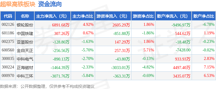 从资金流向上来看,当日超级高铁板块主力资金净流入1387.3万元,游资资金净流出1282.12万元,散户资金净流出105.18万元。超级高铁板块个股资金流向见下表: