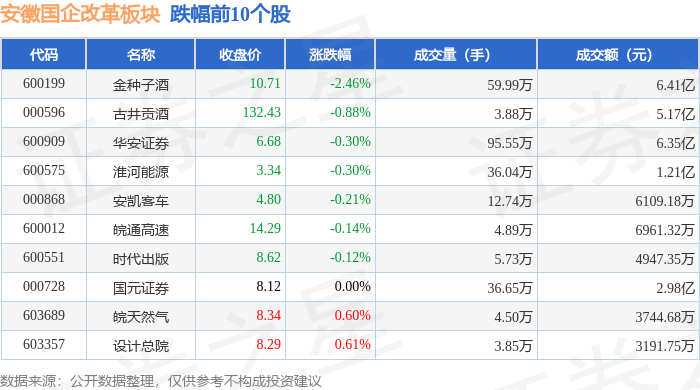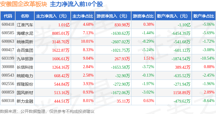 从资金流向上来看,当日安徽国企改革板块主力资金净流出6.35亿元,游资资金净流入2577.87万元,散户资金净流入6.09亿元。安徽国企改革板块个股资金流向见下表: