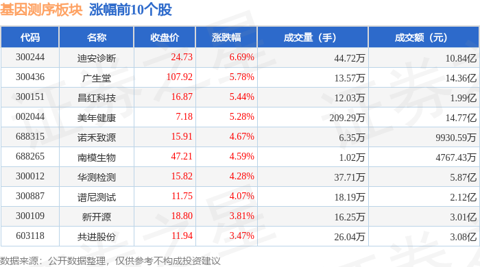 证券之星消息,2月3日基因测序板块较上一交易日上涨1.99%,迪安诊断领涨。当日上证指数报收于4067.74,上涨1.29%。深证成指报收于14127.1,上涨2.19%。基因测序板块个股涨跌见下表: