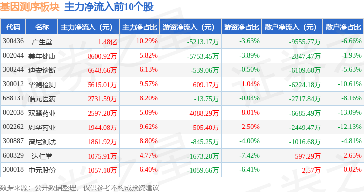 从资金流向上来看,当日基因测序板块主力资金净流入2.5亿元,游资资金净流出2.04亿元,散户资金净流出4566.81万元。基因测序板块个股资金流向见下表: