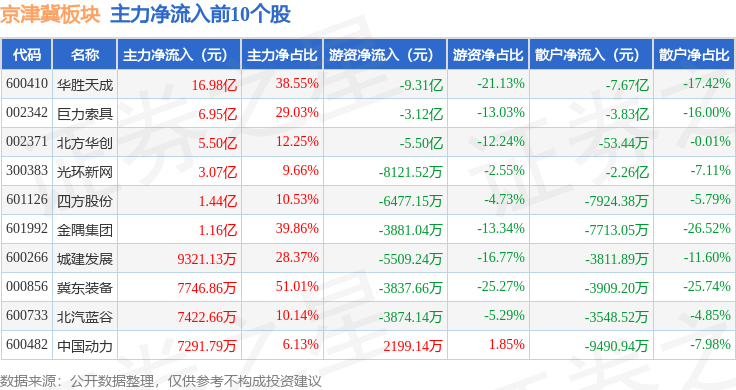 从资金流向上来看,当日京津冀板块主力资金净流入33.53亿元,游资资金净流出22.21亿元,散户资金净流出11.32亿元。京津冀板块个股资金流向见下表: