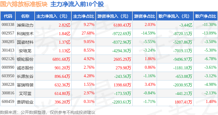 从资金流向上来看,当日国六排放标准板块主力资金净流入6.37亿元,游资资金净流出1.0亿元,散户资金净流出5.37亿元。国六排放标准板块个股资金流向见下表: