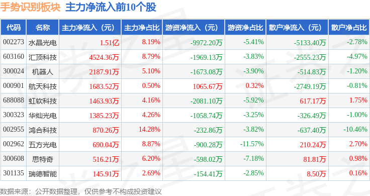 从资金流向上来看,当日手势识别板块主力资金净流入8892.96万元,游资资金净流出3.17亿元,散户资金净流入2.28亿元。手势识别板块个股资金流向见下表: